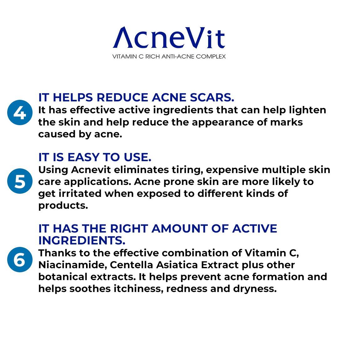 Acnevit does not contain Benzoyl Peroxide, Azelaic Acid, Salicylic Acid, antibiotics or hormones; these can cause dryness, irritation, burning and itching of the skin.