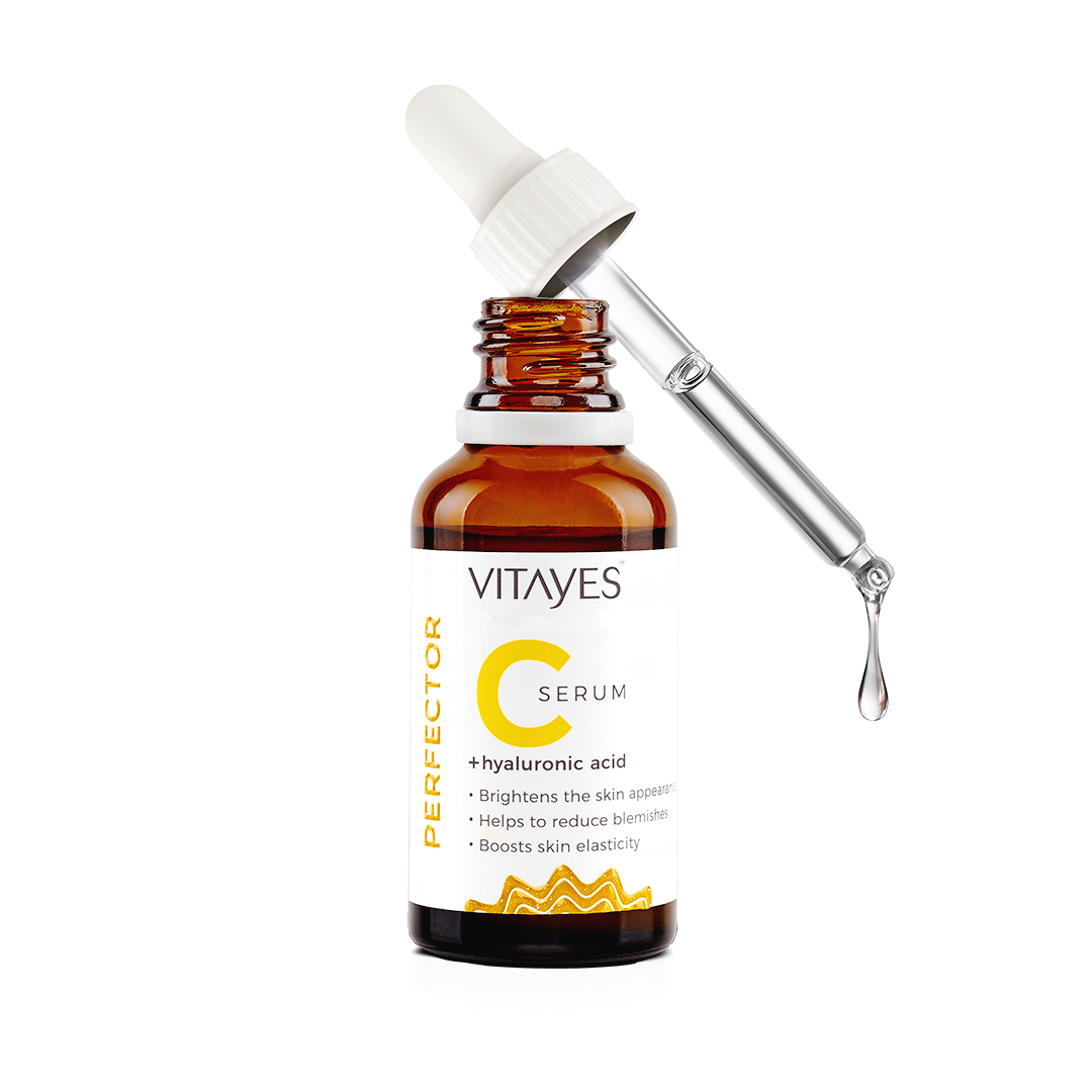 Our Vitayes Perfector C-Serum smoothes light wrinkles, fine lines and sagging skin very effectively with organic vitamin C and high-dose hyaluronic acid. With immediate effect and long-term effect. The rich active ingredient complex contains the optimal combination of high quality, organic, vitamin C and pure, vegan hyaluronic acid. Perfector C Serum against pigment spots and skin discoloration. The lightening effect is unmistakable.